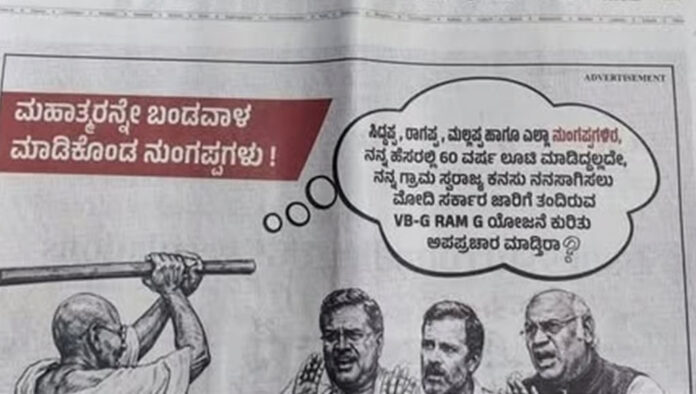 ಬೆಂಗಳೂರು: ಮನರೇಗಾ ಮತ್ತು ವಿಬಿ ಜಿರಾಮ್ ಜಿ ವಿಚಾರವಾಗಿ ಬಿಜೆಪಿ ಮತ್ತು ಕಾಂಗ್ರೆಸ್ ನಡುವೆ ತೀವ್ರ ಜಟಾಪಟಿ ನಡೆಯುತ್ತಿದೆ. ಕಾಂಗ್ರೆಸ್ ಸಂಘಪ್ಪ ಎಂದು ಉಲ್ಲೇಖಿಸಿ ಮಹಾತ್ಮಾ ಗಾಂಧಿ ಅವರ ಹೆಸರನ್ನು ಬಳಕೆ ಮಾಡಿ ಜಾಹೀರಾತು ನೀಡಿತ್ತು. ಇದೀಗ ಬಿಜೆಪಿ ನುಂಗಪ್ಪ ಎಂಬ ಜಾಹೀರಾತು ಮೂಲಕ ತಿರುಗೇಟು ನೀಡಿದೆ.