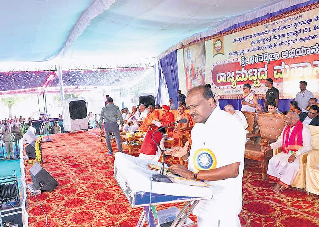 ಭಾನುವಾರ ನಡೆದ ಭಗವದ್ಗೀತಾ ಅಭಿಯಾನ ಮಹಾಸಮರ್ಪಣೆ ಕಾರ್ಯಕ್ರಮದಲ್ಲಿ ಮಾಜಿ ಡಿಸಿಎಂ ಕೆ ಎಸ್ ಈಶ್ವರಪ್ಪ ಭಗವದ್ಗೀತೆಯನ್ನು ಪಠ್ಯಪುಸ್ತಕಗಳಲ್ಲಿ ಸೇರಿಸುವಂತೆ ಕುಮಾರಸ್ವಾಮಿ ಅವರಿಗೆ ಮನವಿ ಮಾಡಿದರು.ತದ ನಂತರ ಮಾತನಾಡಿದ ಕುಮಾರಸ್ವಾಮಿ, ಮುಂದಿನ ದಿನಗಳಲ್ಲಿ ಕ್ರಮಗಳನ್ನು ಪ್ರಾರಂಭಿಸುವುದಾಗಿ ಭರವಸೆ ನೀಡಿದರು.