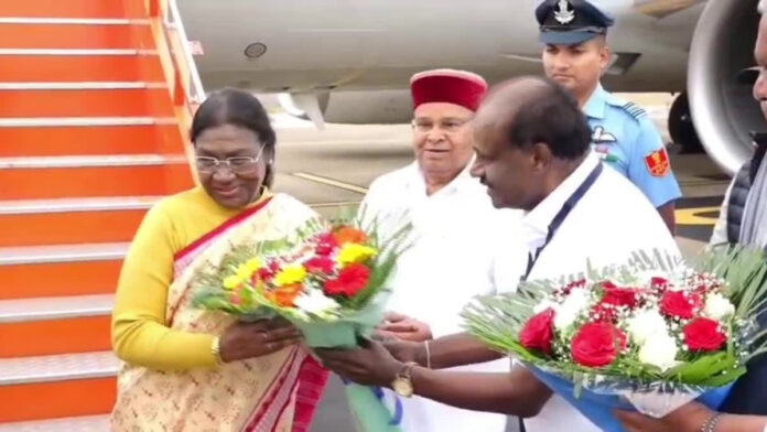 ರಾಜ್ಯಕ್ಕೆ ಬಂದ ರಾಷ್ಟ್ರಪತಿಗಳನ್ನು ಸ್ವಾಗತಿಸಿದ ರಾಜ್ಯಪಾಲರು; ಈ ಸಂದರ್ಭದಲ್ಲಿ ರಾಜ್ಯಪಾಲ ಥಾವರ್ ಚಂದ್ ಗೆಹ್ಲೋಟ್, ಕೇಂದ್ರ ಸರ್ಕಾರದ ಉಕ್ಕು ಮತ್ತು ಬೃಹತ್ ಕೈಗಾರಿಕಾ ಸಚಿವ ಹೆಚ್.ಡಿ.ಕುಮಾರಸ್ವಾಮಿ, ಪಶುಸಂಗೋಪನೆ ಹಾಗೂ ರೇಷ್ಮೆ ಇಲಾಖೆ ಸಚಿವ ಕೆ. ವೆಂಕಟೇಶ್ ಅವರು ಹೂ ಗುಚ್ಛ ನೀಡುವ ಮೂಲಕ ರಾಷ್ಟ್ರಪತಿಗಳನ್ನು ಸ್ವಾಗತಿಸಿದರು. ಈ ವೇಳೆ ಜಿಲ್ಲಾಧಿಕಾರಿ ಜಿ.ಲಕ್ಷ್ಮಿಕಾಂತ ರೆಡ್ಡಿ, ಮೈಸೂರು ನಗರ ಪೊಲೀಸ್ ಆಯುಕ್ತರಾದ ಸೀಮಾ ಲಾಟ್ಕರ್ ಮತ್ತಿತರರು ಇದ್ದರು.