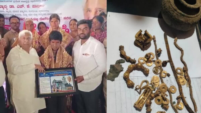 ಗದಗ : ಐತಿಹಾಸಿಕ ಲಕ್ಕುಂಡಿ ಗ್ರಾಮದಲ್ಲಿ ಪತ್ತೆ ಆಗಿರುವ ನಿಧಿಯಲ್ಲಿ 466 ಗ್ರಾಂ ಚಿನ್ನಾಭರಣಗಳು ಮತ್ತು 634 ಗ್ರಾಂ ತಾಮ್ರದ ತಂಬಿಗೆ ಪತ್ತೆಯಾಗಿದ್ದು, ಅವುಗಳನ್ನು ಜಿಲ್ಲಾಡಳಿತ ತನ್ನ ವಶಕ್ಕೆ ಪಡೆದುಕೊಂಡಿದೆ. ಈ ಸಂಪೂರ್ಣ ಘಟನೆ ಬೆಳಕಿಗೆ ಬರಲು ಕಾರಣನಾದ 14 ವರ್ಷದ ಬಾಲಕ ಪ್ರಜ್ವಲ್ ರಿತ್ತಿ ಅವರ ಪ್ರಾಮಾಣಿಕತೆ ನಿಜಕ್ಕೂ ಅನುಕರಣೀಯ ಎಂದು ಜಿಲ್ಲಾ ಉಸ್ತುವಾರಿ ಸಚಿವ ಹಾಗೂ ಕಾನೂನು ಮತ್ತು ಪ್ರವಾಸೋದ್ಯಮ ಸಚಿವ ಹೆಚ್. ಕೆ. ಪಾಟೀಲ್ ಅವರು ಹೇಳಿದರು.